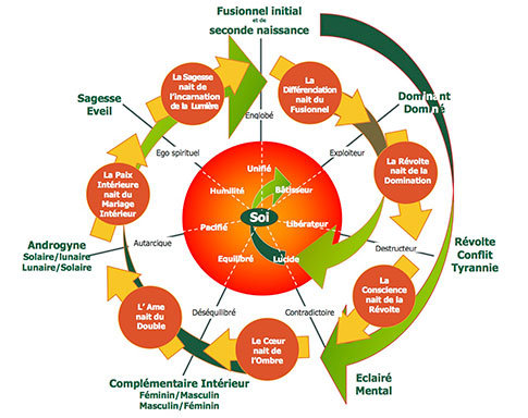 Trois blessures accompagnent les trois premiers stades. Quatre réalisations apparaissent dans les quatre stades suivant. Un mouvement en spirale se dessine jusqu'à la jonction avec le SOI. L’amour s’épanouit avec l’éveil. La femme fusionnelle mais divine et sacrée dans le rayon de la Déesse Mère expérimente la soumission et la domination, s’accroche au conflit, à la tyrannie, femme révoltée, destructrice ou libérée. La femme éclairée lucide et contradictoire incarne la dualité du mental et de l’égo. Le masculin et le féminin tentent de former un couple intérieur équilibré et se dirigent vers un androgynat, pacifié et autarcique. La femme sage et éveillée glisse vers le Soi.