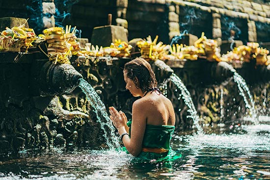 Pour une purification plus efficace, il lui sera sans doute suggéré de se rendre au temple de Tirta Empul, dédié à Shiva, Vishnou et Brahma ; il s’y trouve un bassin auquel aboutissent treize sources sacrées. Selon sa pathologie, le voyageur se place sous l’une d’elles en récitant un mantra et boit son eau en la recueillant avec les mains.